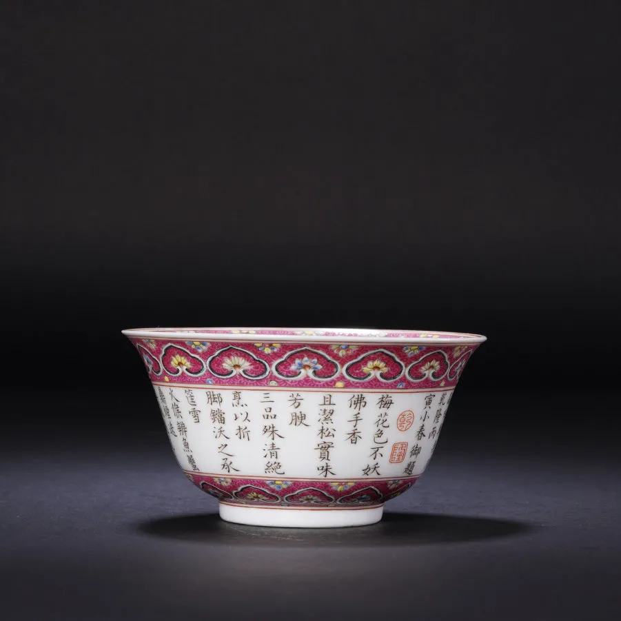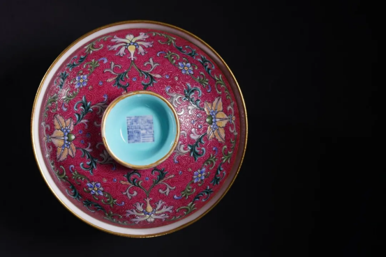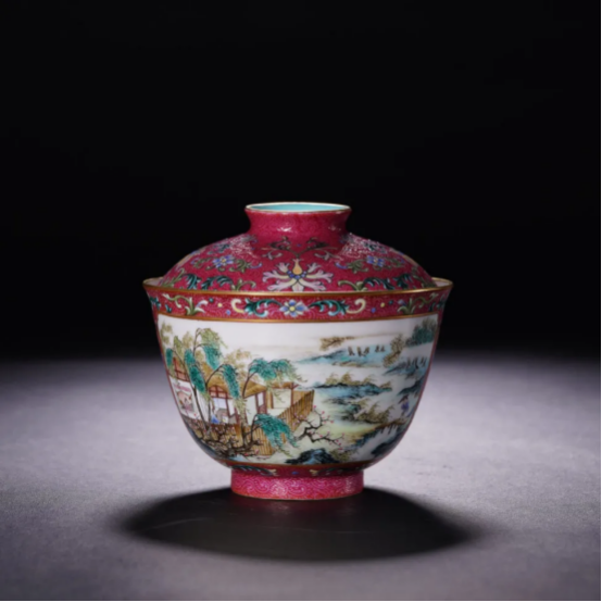 洋彩胭脂紫地轧道蕃莲开光御制诗“雨中书室烹茶图”盖碗,它的器身和盖面都是以胭脂红轧道洋彩西洋蕃莲花卉为地,碗身腹部正、背面各有一开光。正面描金倭角开光内以“雨中烹茶”为题,绘庭院烹茶图。背面为描金彩倭角开光内题墨书御制诗一首,为清乾隆七年(1742年)御制《雨中烹茶泛卧游书室有作》出自《御制诗初集卷九》,句末钤“乾”(圆)、“隆”(方)篆书印章款。这件是乾隆御瓷风格的典范,深获他的青睐,珍藏于紫禁城内廷乾清宫及圆明园之中。