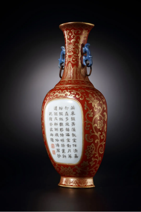 清乾隆 御制霁红釉火焰青描金御题诗胆式瓶,诗前有"乾隆御制"四字,并绘"乾""隆"二字篆书方章。这首诗收录于《乐善堂全集》卷三七,这件题写《乐善堂全集》收录诗文的瓷器,做于乾隆十七年及以前,就是厥功至伟的唐英督陶期间。乾隆皇帝曾在《咏瓷挂瓶》一诗中提到,"胆瓶、纸槌瓶,皆瓶式最佳者"。可想而知,这个瓶子当时一定颇得帝王喜爱。