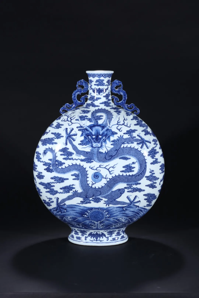 青花海浪福寿云龙抱珠纹双螭龙耳大抱月瓶