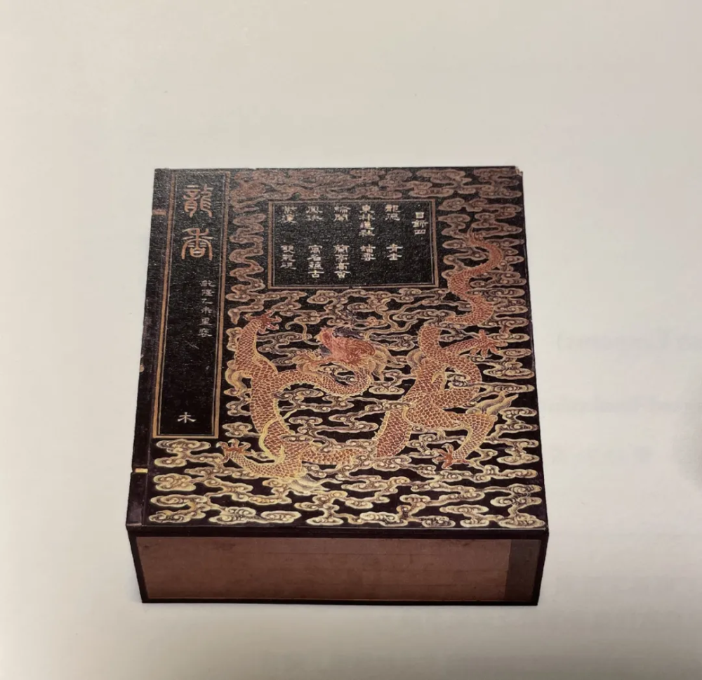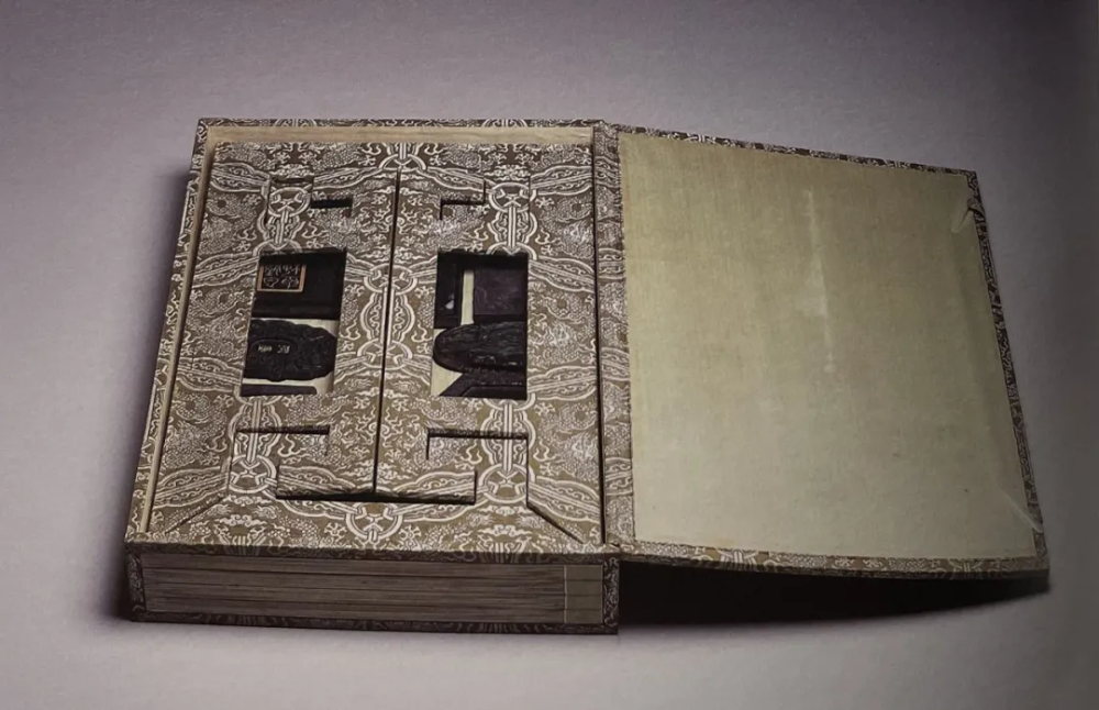 本套“龙香”御墨,即是以御墨煤烟为主,并与“龙香剂”诸药品相互混合而成的具有独特香气的高级墨品。整套御墨做工精良,原装漆匣,不易的是内部锦匣亦保存完好。函盒为硬板折合式,内铺米黄色云锦素缎,依墨形挖槽盛装,使嵌入之御墨严丝合缝,结构巧妙,将墨与函匣融为一体,并及漆盒,成为难以分割的艺术品。函盒外包为湘色双重锦,选料上乘,织以盘绦云龙戏珠纹,两岸故宫皆藏有相似品。此盒所用双重锦又称二色锦,正反面可互为花纹,经纬均无捻,织造时不用短跑棱。因其花纹密集,耐磨性能好,故清初之际宫廷多用于装裱书籍经卷、囊匣锦盒,乾隆朝之后因织造技术不足,愈加鲜见。