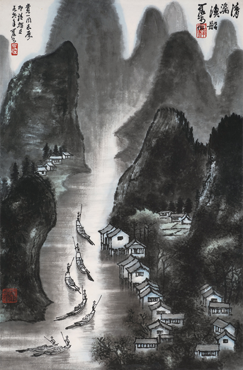 注:漓江题材始于画家一九五九年桂林写生,然景色虽美,入画甚难,可染遂取「以大观小法」构图,万青力解读为「也就是减弱远近透视大小差别,人为地扩展境界。如果真的站在江边,则看不到这么多,这么远,船也不会这么清楚」。后经画家提炼、衍生出不同版本,如以浓墨重色皴染层层山峦,营造雄伟气势;亦有取清淡调子表现漓江之空蒙迷离,「如置身水晶宫中」。本幅布景、色调接近后者,群山、树荫以淡墨、淡花青层层积染,淡而不薄,清润通透。江水留白,成全幅最亮处,兼以细笔写渔船,将观者视线吸引至这一「画眼」,可见画家驾驭此题材已臻炉火纯青之境。