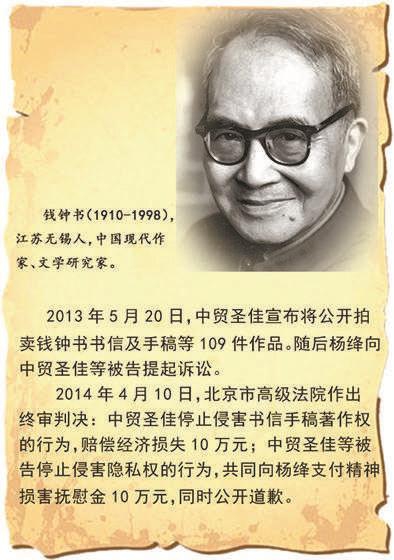 2013年5月,中贸圣佳拍卖公司宣布将钱钟书、杨绛及其女儿钱媛所写书信进行拍卖,杨绛以涉嫌侵害著作权和隐私权为由起诉,最终法院判决认定拍卖公司侵犯了钱钟书、杨绛等三人的隐私权。