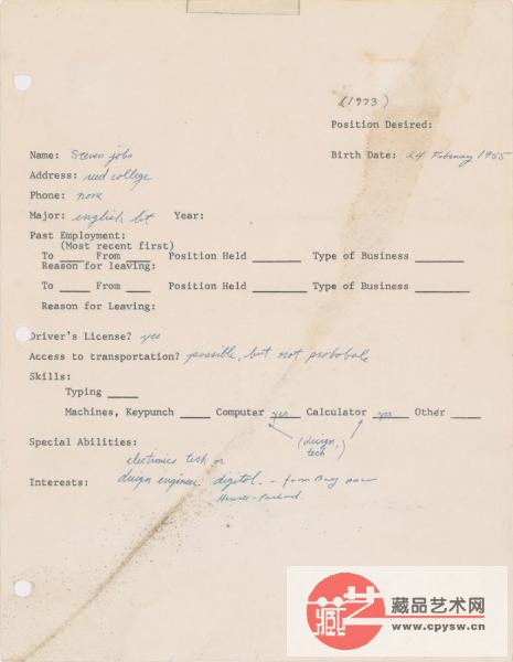 一间拍卖行“RR Auction”指这文件于1973年填写,乔布斯当时刚从里德学院(Reed College)休学。乔布斯认为大学生涯对于他未来的规划毫无作用,在文件中指出了一些有趣的事实。