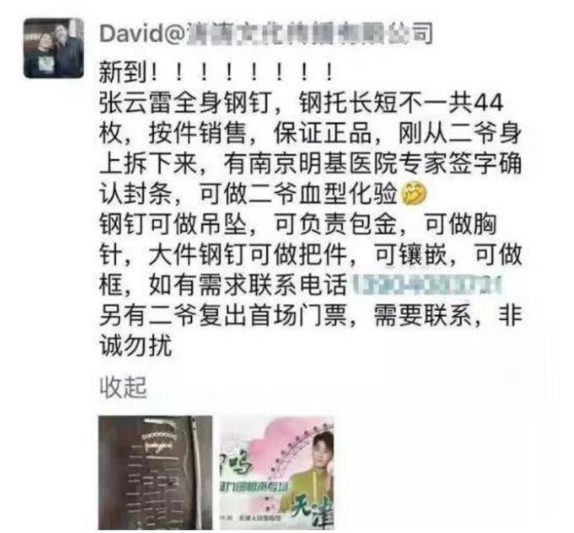 可令人意想不到的是,张云雷前脚刚从医院出来,后脚就有网友爆料,称“有人在朋友圈售卖从张云雷身上拆下来的钢钉,还保证有专家签字确认封条”。不仅如此,这卖家还可支持订做吊坠、胸针等饰品。