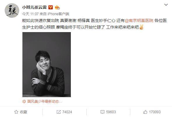 经过一个多月的调养休息之后,张云雷终于在3月20日康复出院了,还在微博上感谢了此番照料他的医护人员,并与大家分享了这一好消息。配文“摩羯座终于可以开始忙碌了,工作来吧来吧来吧”。看样子辫儿哥哥是迫不及待的要开启“劳模”模式了。
