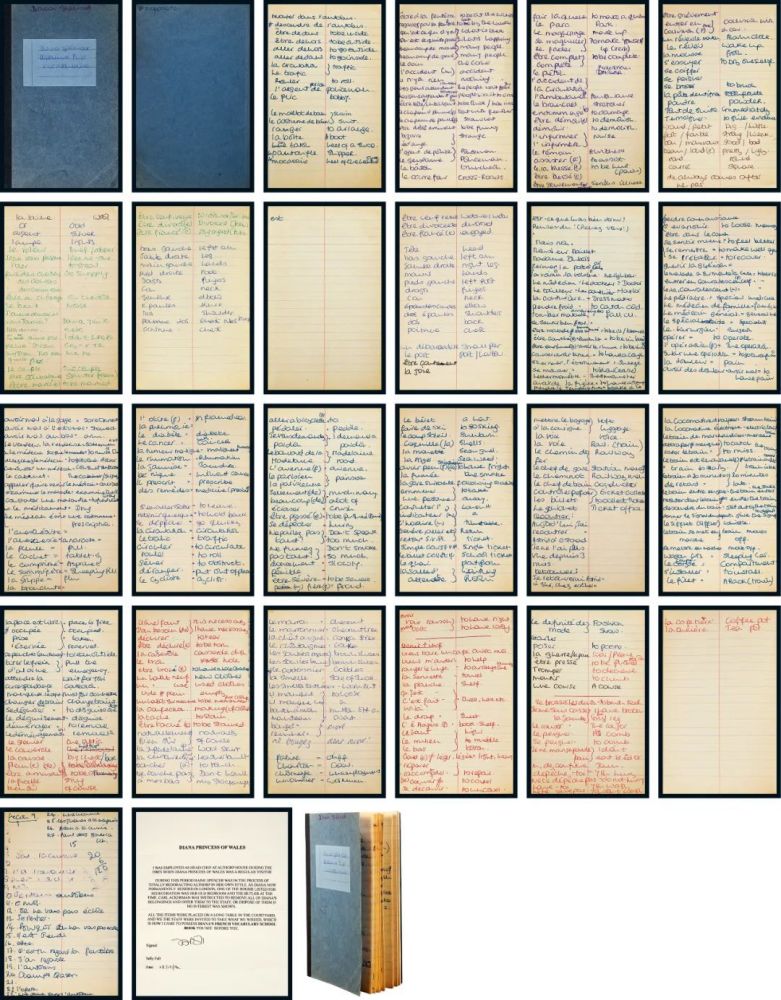 戴安娜王妃出生于英国诺福克,是爱德华斯宾塞伯爵的小女儿。此件拍品为戴安娜王妃高中在瑞士维德马内特学院就读时期的手书法语词汇笔记本,作于1978年左右。笔记本的封面上用蓝色水笔全名签名“戴安娜•斯潘塞”以及用法语标注“禽类词汇”。 日记本内文有整整21页的戴安娜王妃亲笔手写笔记,内容包括词汇表的单词和词组以及法语到英语的翻译。