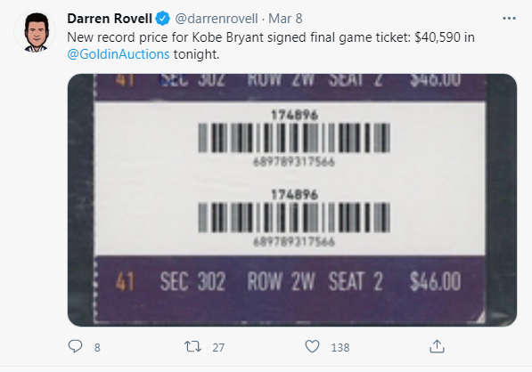 北京时间3月9日,科比在其职业生涯最后一战的比赛中狂飙60分,创下了史诗级的经典战役,根据报道,这场比赛的亲笔签名门票近日在拍卖中拍出40590美元的高价。