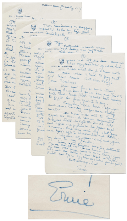 这封信写于1954年4月17日,但年份被误印为1953年。全文共计4页,是海明威在经历两次飞机失事后写给律师阿尔弗雷德·赖斯(Alfred Rice)的信件。1954年1月,海明威和妻子玛丽踏上了拍摄乌干达默奇森瀑布的飞行之旅。然而,旅途中,飞行员试图避免撞到一群朱鹮因而紧急着陆,但不幸坠毁。机上幸存者在丛林中扎营度过了一夜。第二天,他们被一艘客船接走,并登上了第二架飞机。没想到这架飞机在起飞时着火,发生爆炸。