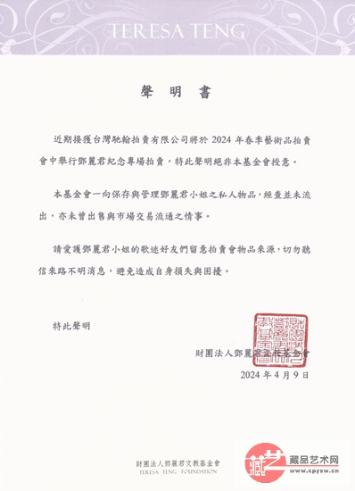 对此,邓丽君文教基金会发声明称,传闻中提及有拍卖公司将于2024年春季艺术品拍卖会中举行的邓丽君纪念专场拍卖,绝非基金会授意,声明称:本基金会一向保存与管理邓丽君小姐之私人物品,经查并未流出,亦未曾出售与市场交易流通。