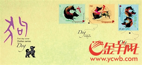 新加坡 新加坡邮政于1月5日发行了2018年狗年邮票,共三枚邮票三个票值,狗的设计风格一致。