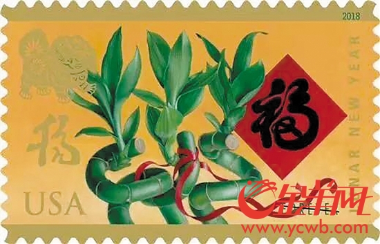 美国 1月11日,美国邮政发行了中国农历生肖狗年邮票1枚,这也是美国邮政2018年的第一套新邮。这枚邮票由居住在纽约的华裔艺术家麦锦鸿设计。邮票以突出庆祝农历新年时的风俗传统为主,没有将生肖本身作为图案的主角,今年狗年邮票的主角就是富贵竹。