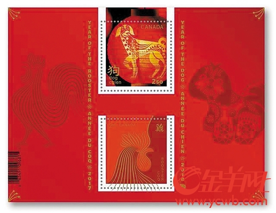 加拿大加拿大邮务公司1月15日推出狗年生肖邮票及附属产品。其中寄加拿大国内“P”邮资的狗年邮票,主图是灯光灯笼,灯笼上画有一头摇尾示好的红色小狗,而邮票左下角印有中英文及法文的狗字。