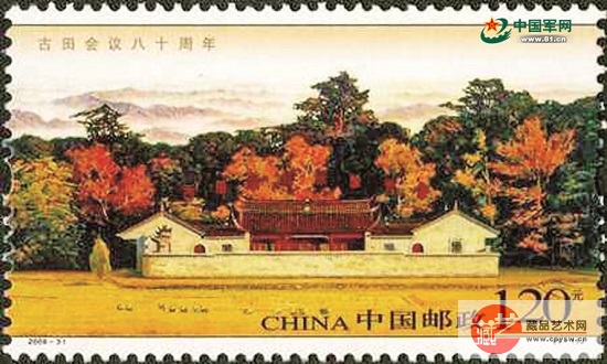 最下面这张邮票上的图案为古田会议会址,即1929年12月28日在福建省上杭县古田村召开的红四军第九次党的代表大会。