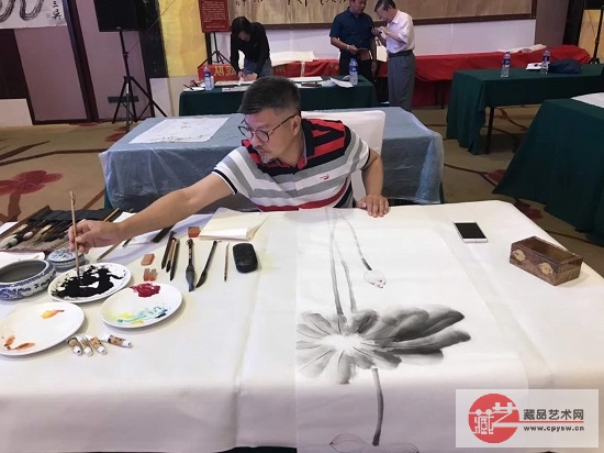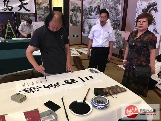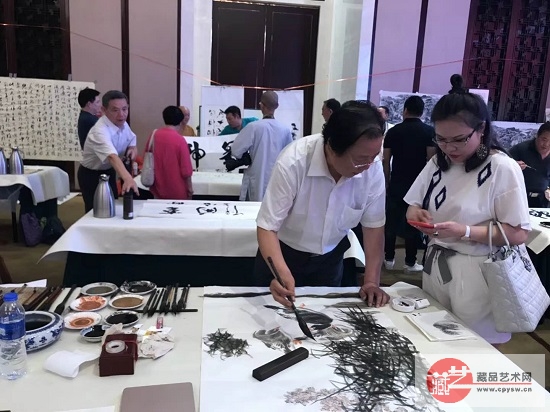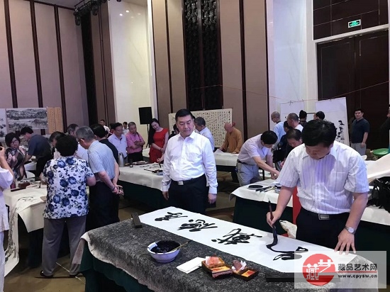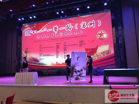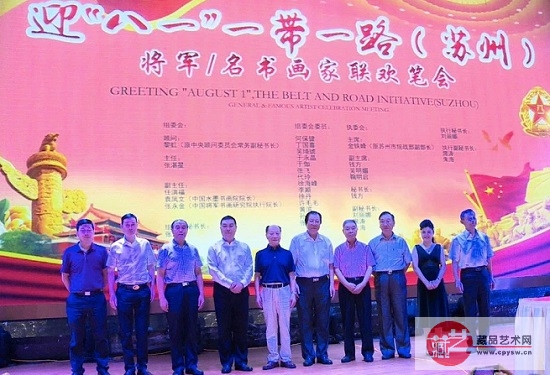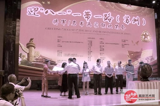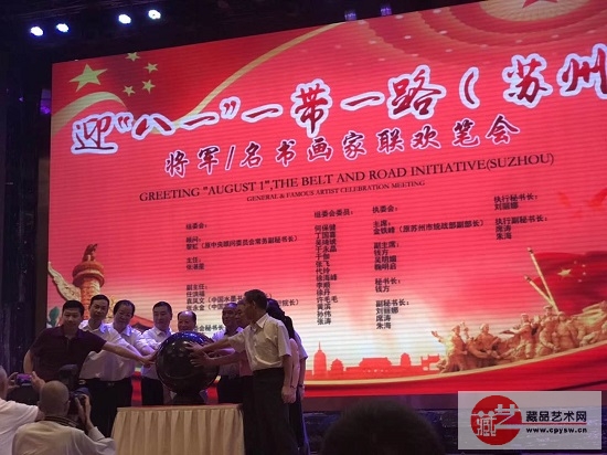 藏品艺术网苏州7月17日讯 为响应国家主席习近平一带一路的号召,喜迎中国人民解放军第91个建军节,迎“八一”一带一路(苏州)将军/名书画家联欢笔会14日在苏州金科大酒店隆重举办。活动组委会主任张湛星带领组委会全体成员经过数月的精心筹划,使得本次活动圆满成功举办。原南京军区副司令员徐承云中将、原江苏省军区副司令员苏海杉少将、原总参军务部副部长杨新华少将、中国将军书画研究院执行院长张永金先生、中国水墨书画院院长袁凤文先生、苏州市统战部原副部长金铁峰,苏州市委宣传部文艺处盛征处长、苏州文广新局艺术处冷建国处长、苏州市文联创研部庞曦主任、活动执委会秘书长钱方、活动执委会副主任吴明媚、执委会执行秘书长刘丽娜、海内外友人、港澳台侨胞及书画家代表等领导嘉宾一行百余人参加了该活动。