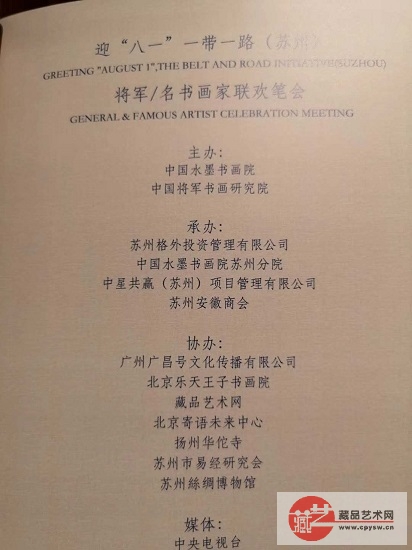 本次活动由中国水墨书画院、中国将军书画研究院主办。由苏州格外投资管理有限公司、中星共赢(苏州)项目管理有限公司、中国水墨书画院苏州分院、苏州安徽商会承办。协办单位有广州广昌号文化传播有限公司、北京乐天王子书画院、藏品艺术网、北京寄语未来中心、扬州华佗寺、苏州市易经研究会、苏州丝绸博物馆。