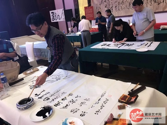 笔会活动现场,老将军们与书画名家们一起挥毫创作。