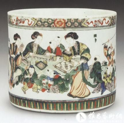 清康熙五彩四妃十六子纹笔筒,高15.3厘米,口径18厘米,底径17.6厘米。瓷质,圆筒形。敞口,直壁,大平底。内外施白釉,外壁绘五彩。口沿绘杂宝和锦地花卉相间,腹部主题纹饰绘四妃十六子于庭院中嬉戏玩耍。四妃十六子典故出自宋高承《事物纪原·帝王后妃·四妃》:“三代(夏商周)有夫人而无妃号,汉有贵人,魏始置妃,此夫人号妃之始也。唐初皇后而降,有贵、淑、德、贤,是为四妃也。”十六子为十六相或十六族的引申,指古代传说中的高阳氏的后代八恺和高辛氏的后代八元。此为舜向尧推荐的十六贤臣,因各有大功,皆赐姓氏,故称十六族,也称十六相。康熙瓷人物题材种类繁多,四妃十六子为当时较为常见的高雅图案。画面上,四位女子和十六个儿童神态各异,女子丰颜高髻,长裙曳地,眉如弯月,气质高贵,形态逼真;十六子有的在下棋,有的在玩耍,有的在捉迷藏,有的则在附耳说着悄悄话,显得活泼可爱生动传神,童趣横生。筒体满身绘画,衬以树木、栏杆、花草、几凳等,胎质细密,釉色浆白,画面生动有趣,色泽五彩艳丽。这件笔筒上的纹饰有着望子成龙、妻贤子孝的美好寓意。