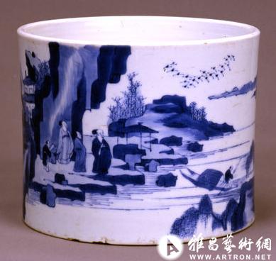 清康熙青花山水人物笔筒,高15厘米,口径18.5厘米。瓷质,圆筒形。清康熙年间青花颜色清丽,瓷笔筒品种多,主要有青花、斗彩、釉里红、豆青釉、乌金釉、祭蓝釉三彩、五彩等,装饰图案丰富多彩。据邵蛰民所撰《增补古今瓷器源流考》载:“青花绘山水、人物、花卉及书辞赋之笔筒以康熙一代为最多。”这件青花山水人物笔筒以青花描绘山水人物,采用了“分水皴”的绘画技法,画面布局结构合理,暗淡分明,极富立体之美。只见在深秋的山野上,远处青山如黛楼台耸立,近处山石嶙峋流水潺缓,几株柳树枝叶扶疏,老树则苍劲挺拔,大雁排成“人”字高高飞过天际。一条渔船缓缓行进在河流上,船工撑着长篙,神态悠闲。岸边亭阁边,几个行人在岸边伫立,有的正仰头眺望天上飞过的雁群,有的正惬意地看着渔翁驾舟,身后山岩之侧有楼阁高耸,好一幅和谐宁静的山野渔村闲时景致尽收眼底。整件器物保存完好,胎质洁白细腻,釉色均匀,浓艳翠蓝,显得端庄大气,实属一件难得的康熙御窑佳瓷。有这样一件瓷笔筒摆放在书案之上,朝夕相伴,着实为文房增添了无限情趣。
