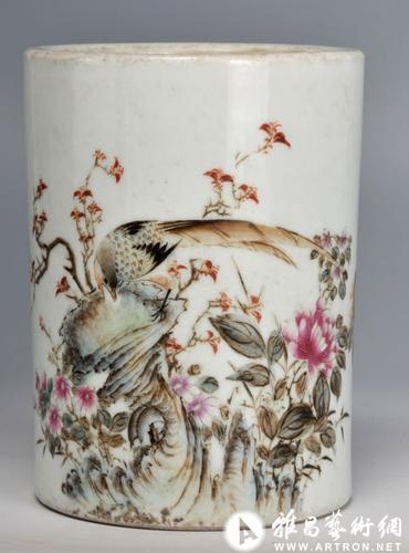 瓷笔筒:这类笔筒大多是由瓷画艺人用粉彩原料绘制,有青花、青花釉里红、墨彩、五彩、粉彩、三彩、颜色釉等,或人物,或山水,或花鸟,或书法,或诗文,林林总总,不一而足。然后经过窑火烧制而成,色泽温润。瓷笔筒具有胎釉独特、瓷画精美等特点,现在见到的明代瓷笔筒多为上下直口和撇口,器壁直筒形或略有束腰,口至底胎体渐厚,器口露胎或施酱釉,题材纹饰以人物故事为主。到了清代,瓷质笔筒盛行,如康熙时期的青花笔筒,雍正时期的墨彩笔筒,乾隆时期的粉彩笔筒,山水、人物、花鸟、松鹤、百寿字等是笔筒上常见的纹样题材,体现了各个时期瓷笔筒烧制的最高水平。