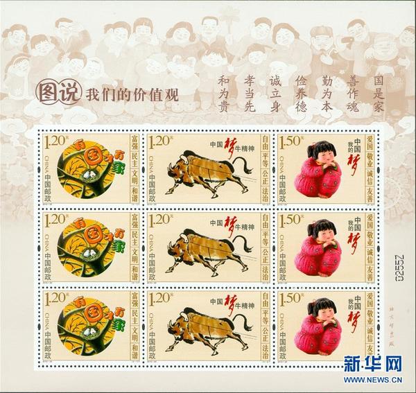 11月29日,中国邮政发行“图说我们的价值观”特种邮票,邮票一套共3枚,取材于中宣部宣教局组织创作的“图说我们的价值观”公益广告作品,分别为“有国才有家”“中国梦牛精神”“中国梦我的梦”,同时还印有社会主义核心价值观12个主题词。邮票主题突出、寓意深刻,形象生动地传播了中国梦和社会主义核心价值观。图为“图说我们的价值观”特种邮票图样。 新华社发