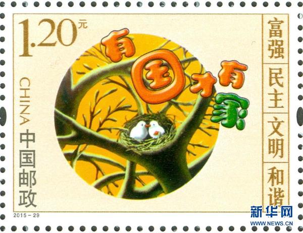 11月29日,中国邮政发行“图说我们的价值观”特种邮票,邮票一套共3枚,取材于中宣部宣教局组织创作的“图说我们的价值观”公益广告作品,分别为“有国才有家”“中国梦牛精神”“中国梦我的梦”,同时还印有社会主义核心价值观12个主题词。邮票主题突出、寓意深刻,形象生动地传播了中国梦和社会主义核心价值观。图为“图说我们的价值观”特种邮票“有国才有家”系列图样。 新华社发