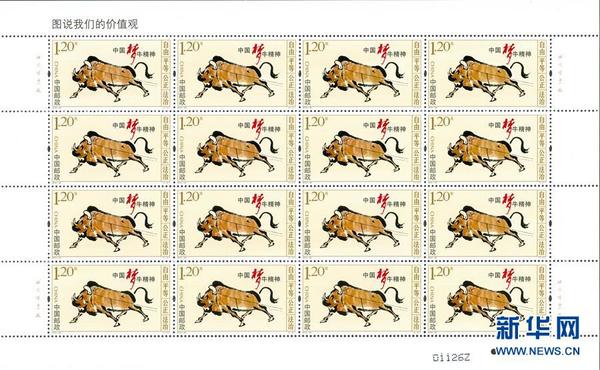 11月29日,中国邮政发行“图说我们的价值观”特种邮票,邮票一套共3枚,取材于中宣部宣教局组织创作的“图说我们的价值观”公益广告作品,分别为“有国才有家”“中国梦牛精神”“中国梦我的梦”,同时还印有社会主义核心价值观12个主题词。邮票主题突出、寓意深刻,形象生动地传播了中国梦和社会主义核心价值观。图为“图说我们的价值观”特种邮票“中国梦 牛精神”系列图样。 新华社发