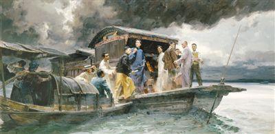 1921年7月23日,中国共产党第一次全国代表大会在上海法租界开幕;7月30日晚,会场遭法租界巡捕搜查,经代表们商定,8月2日,中共一大最后一天的会议在嘉兴南湖的一条船上举行。《启航——中共一大会议》采用写实主义的手法,再现了中共一大南湖会议的历史瞬间:毛泽东、董必武、何叔衡、张国焘、李达等13位一大代表正在登船。在画面中,毛泽东处于构图的中心,身着蓝色长衫,肩挎包袱,正站在船头回首眺望,显得意气风发。作品以光影的变幻暗示环境艰险和时局动荡,烘托“启航”的庄严主题。