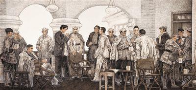 1927年8月1日,由中国共产党在江西南昌发起的针对中国国民党反共政策的武装起义,称为“南昌起义”。作者将人物和建筑平面铺开,营造了一个既恢宏大气又疏密有致的总体效果。领袖人物被安排在台阶上,左右两群士兵的表现费尽思量,不管是服饰、兵器,还是发型、动作,各有千秋、异中求同。作者巧妙地将步枪作为最重要的道具,枪的密集不仅使拥挤的人群有了共通的媒介,而且高举向上的枪支形成了一股股向上升腾的气势,将士兵们兴奋之情渲染得有声有色,富有寓意;举重若轻的笔墨处理使画面摆脱了以往历史画过于沉重的负担,视觉上更加符合现代人的审美。