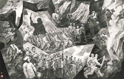 1935年1月15日至17日,中共中央政治局在贵州遵义召开了独立自主地解决中国革命问题的一次极其重要的扩大会议。这次会议开始确立实际以毛泽东为代表的马克思主义的正确路线在中共中央的领导地位,是中国共产党历史上一个生死攸关的转折点,标志着中国共产党从幼稚走向成熟。作品综合运用散点透视与焦点透视,将人物群像塑造和心理建构相结合。