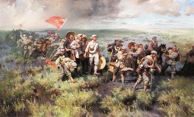 1935年8月,红军开始过草地。草地行军所遇到的困难难以想象,超越了人体所能承受的极限,但红军指战员始终保持高昂的激情,他们依靠积极乐观的革命精神与坚忍不拔的钢铁意志,将困难和艰险甩在身后,前仆后继,一往无前。《红军过草地》既描绘了红军艰难前进的场面,又突出了前途光明的寓意。作者用充满理想主义色彩的笔调,描绘了红军战士在环境恶劣的草地上艰难前进的场面。红军战士们相互搀扶、相互鼓励,表现出集体的温暖。