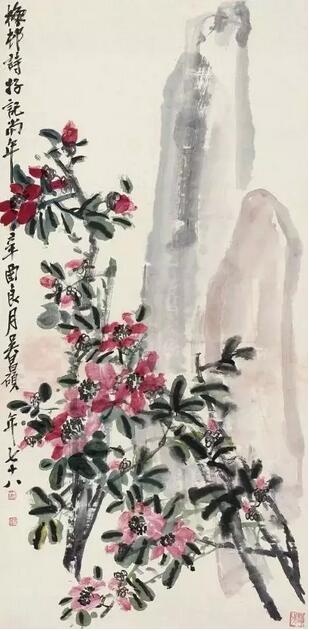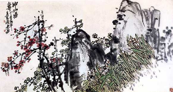 山茶花图 神仙福寿 1904年,杭州西泠印社成立,吴昌硕被推为首任社长,艺名益扬,有《缶卢集》、《缶卢诗存》、《缶卢印存》及书画集多种刊行。 吴昌硕最擅长写意花卉,受徐渭和八大山人影响最大,由于他书法、篆刻功底深厚,他把书法、篆刻的行笔、运刀及章法、体势融入绘画,形成了富有金石味的独特画风,他自己说:“我平生得力之处在于能以作书之法作画。”他常常用篆笔写梅兰,狂草作葡萄。所作花卉木石,笔力老辣,力透纸背,纵横恣肆,气势雄强,布局新颖,构图也近书印的章法布白,喜取“之”字和“女”的格局,或作对角斜势,虚实相生,主体突出。用色上似赵之谦,喜用浓丽对比的颜色,尤善用西洋红,色泽强烈鲜艳。名重当时的画家任伯年对吴昌硕以石鼓文的篆法入画拍案叫绝,并预言其必将成为画坛的中流砥柱。吴昌硕作画用“草篆书”以书法入画;线条功力异常深厚。虽然从状物绘形的角度看其线条的质感似乎不够丰富、切实,但恰恰是舍弃了形的羁绊,吴昌硕的绘画才步入了“意”的厅堂,从而形成了影响近现代中国画坛的直抒胸襟,酣畅淋漓的“大写意” 表现形式。