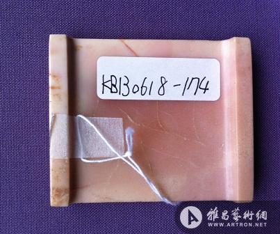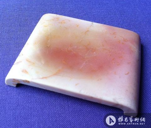 宋寿衣沁白玉墨床(背面) 略厚于台面的足墙 “从造型学上来说,一件器物总是经历一个由简单到繁复的过程。这件器物很有明清墨床雏形的意味。” 显然,明清墨床一脉相承,已臻成熟。然而明清墨床不是凭空出现的,它一定经历了缓慢的发展过程,并且经历了由简单到复杂、由实用起步到具有装饰性的过程。这件器物素面朝天,稳定中求轻巧,简朴中显情趣,线型在圆畅中含转折变化,两侧向下伸展的板足微向外撇,与台面形成大于90度的角度,平稳中略带书卷之气。看似一张微型平面卷曲的几案,下收触底后略微增宽,线条遒劲,刀法犀利。 台北国立故宫博物院登陆保存处处长嵇若昕曾经在《宋代书案上的文房用具》提到:“明晚期以来常见的墨床、臂搁等,宋代似未发展。虽然杭州北大桥南宋墓出土的漆笔格上方凹孔呈长方形者,今人推测用以放墨,亦不可认为宋代文具已有墨床之制。而且,湖北宣化辽墓壁画上,墨常置于砚面,传刘松年所绘《撵茶图》中的墨也斜置于风字砚旁,皆可辅证。”然这种相互辅证虽不算孤例,也不能作为文房家族里缺少墨床的十足依据。毕竟两个例证都让墨块儿缺少承载之物,墨床的滥觞便可能由此起步。有宋一代,墨床或成为少数文人雅士的尝试。 “这件器物更具备宋人的审美情趣。” 与墨床更接近的是砚台,因为在墨床没有出现以前,砚台曾经兼具了墨床的作用:让墨锭躺在砚面上。宋代砚台最具特征的是外形轮廓朴素大方,实用、雅观的抄手砚。那件小器物也具有抄手之神韵:也许受到板足支撑,微微隆起的台面留下的空隙更像宋砚的抄手。我们知道宋代上至皇帝下至文人墨客,都醉心于风花雪月,同时代的砚台也不同程度地受到熏染。文人砚形神兼备,其线条、块面之疏密高低,刀法简练流畅。从总体来看,宋代的工艺美术较之前代的唐代,或者较之后代的明清,更讲求品格,追求境界、注重实用、做工精良、清新典雅。与宋代相比较,前后朝代都具迂腐的社会审美情节,追求繁缛的风格。如果再举审美的例子,就首推被后世推崇的宋代制瓷工艺的最高水平的汝窑。它“大巧不工”、“返璞归真”,釉面青光莹莹、素雅清淡,被徽宗皇帝视为神品。也许正是没有过多的雕琢与妖艳,只以温润如玉的质地、平淡自然的情趣,成为那个时代清雅含蓄、不事张扬的精神符号。在一个重文轻武,文士阶层地位相当高的宋代,要例举文人审美的例子,一定不胜枚举。文人化的社会取向,追求文雅的风格,使得宋代文人崇雅黜俗。 宋寿衣沁白玉墨床 紫红的沁色呈发散的圆形 “这件器物的老化程度仿佛历经数千年,与玲珑剔透明清玉质墨床相比有天壤之别。” 该件器物的质地应为玉质。在没有科学鉴定的前提下,更倾向于是一种地方玉质。虽然表面已经形成一层致密的膜,但在侧光下仍能明显感受到蜡质的光泽。用10倍放大镜细查,可以看见不规则的细微加工磨痕,这是现代电动工具加工所无法仿制的特征。虽然显示出失透的状态,但用强光照射仍可穿透。由于已呈石灰沁或鸡骨白的特征,显示其年代久远。而且这种久远已经不是宋代所能挡得住的,它的物理特征已经很接近文化期时代,比如良渚文化古玉在自然环境下形成的玉质白化。如果加以想象,不排除是宋代文人发幽古之情,将高古的玉器改制成此。由于透闪石内部的结晶水逐步失去,一般会经历红化、失透、白化的渐变过程,再经过阴干和恢复一些硬度后,经过盘玩,人的汗液和油脂沁入后会逐渐恢复莹润,颜色也会逐渐变红。 当然,拍卖公司将这块古玉上微微散发的紫红色形状定为“寿衣沁”,认为是“寿衣”的色沁进入玉里,显然在情理之中。同时我们还看到,这种紫红色沁斑呈现圆形并微微扩散,让人想见,当年可能在上面放置圆形的一块朱砂墨锭,系朱砂沁使然。当然,上述均是依据表象的一种推测。 总之,这是一块年代久远的老玉制作的器物呈现在眼前,它趋向于宋代文人的审美,它的制式和功能更接近于墨床。于是就根据个人的理解做了上述推测。