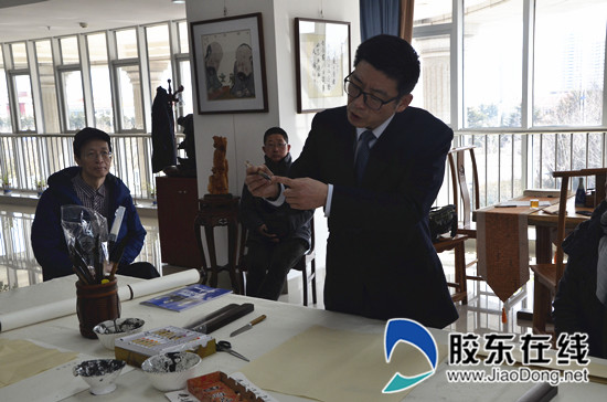 胶东在线3月9日讯(记者 刘孟 通讯员 姜震 杨俊杰)8日上午,烟台农商银行莱山区观海路支行开展书画主题交流开放日活动,近30名书画爱好者齐聚烟台农商银行书画交流中心,一起探讨交流书画知识。莱山区观海路支行是烟台农商银行第一家书画主题银行,书画交流中心定期向书画爱好者及广大市民免费开放。