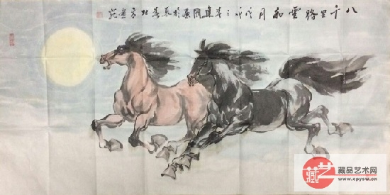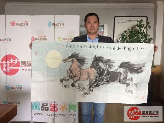4月8日,中国民盟盟员、藏品艺术网执行总编辑、艺委会秘书长王骊丁收藏著名画家刘建国先生挥毫创作的马画作品“八千里路云和月”