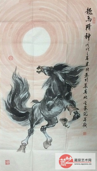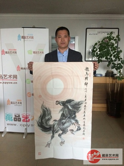4月8日,中国民盟盟员、藏品艺术网执行总编辑、艺委会秘书长王骊丁收藏著名画家刘建国先生挥毫创作的马画作品“龙马精神”