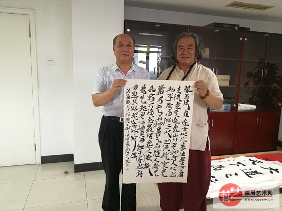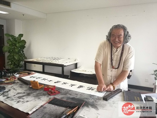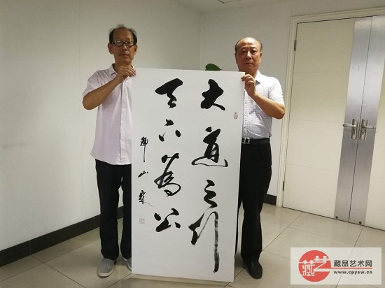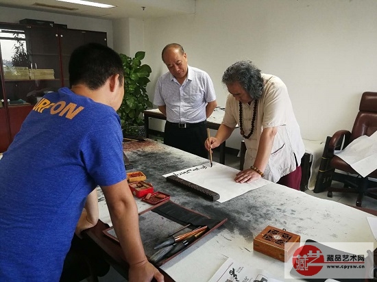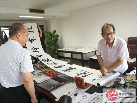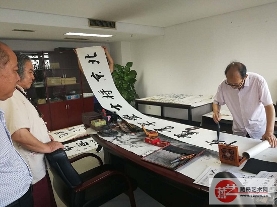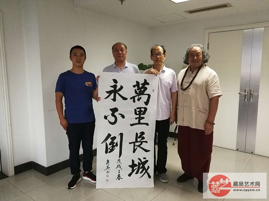 2018年7月26日下午,藏品艺术网在京组织老兵书法家笔会交流,献礼“八一”。图为书法家张成银(右1)、韩山林(右2)与老兵刘宝军(左1)在书法家周春华(左2)创作的“万里长城永不倒”书法作品前一同合影 书法家周春华(右)与书法家韩山林(左)在“大道之行天下为公”作品前留影 书法家张成银在其书写的“虚怀若谷”作品前留影 书法家张成银(右)与书法家周春华(左)一起在作品前留影 藏品艺术网北京7月27日讯 为给“八一”献礼,喜迎中国人民解放军第91个建军节 ,昨天下午,藏品艺术网在京组织老兵书法家韩山林、张成银、周春华与老兵刘宝平、本网总编辑王骊丁等一起挥毫泼墨,笔会交流,创作出“万里长城永不倒”、“大道之行天下为公”、“虚怀若谷”、“将士风采”等多幅书法佳作。 书法家韩山林现场挥毫 书法家张成银现场挥毫 书法家韩山林用印 书法家张成银用印