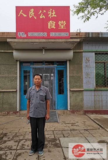 奚利军在自家经营的小吃部前留影,在他的记忆中,始终保持着对伟人毛泽东的深厚感情与无限敬仰,“人民公社食堂”也因此成了其小吃部的“大招牌”。
