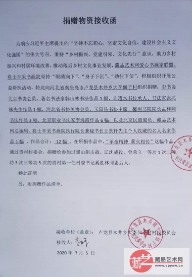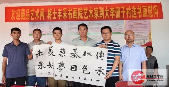 “追寻英雄足迹,陶冶革命精神,挖掘红色资源,建设美丽乡村……”7月5日上午,藏品艺术网爱心书画家联盟、将士丰采书画院来到已故革命伤残军人奚胜林的家乡——卢龙县木井镇大李佃子村开展公益帮扶活动,捐赠多幅文化艺术作品,支持该村文化建设。