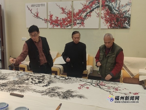 福州新闻网3月21日讯(福州晚报记者 顾伟 文/摄)21日,福建省政协画院联合福建祥谦画院在闽侯祥谦陵园举办纪念“二七”烈士专场书画笔会,来自两个画院的20多名书画名家挥毫泼墨,创作完成了近40幅书画作品,以此纪念林祥谦烈士。 笔会现场记者看到,福建著名画家陈初良、杨东平、温心坦等人分别以水仙花、松树、梅花为题,合作完成了一幅名为《万象昭苏》的国画。他们认为水仙花有平安祝福的含义,松树有强壮的生命力,梅花被民间作为传春报喜的吉祥象征……三者合一,既呈现出春天来了万物复苏的景象,又表达了对革命烈士的敬仰。 二七烈士专场笔会中,著名画家陈初良、杨东平和温心坦在联合创作国画作品。 福建省林祥谦研究会负责人表示,今年是中国共产党成立100周年,也是林祥谦烈士英勇就义98周年。举办纪念“二七”烈士专场书画笔会,目的是为了学史明理、学史增信、学史崇德,更好地传承好红色基因。本次笔会中的部分优秀作品,日后将在祥谦陵园中的“二七烈士纪念堂”展出。