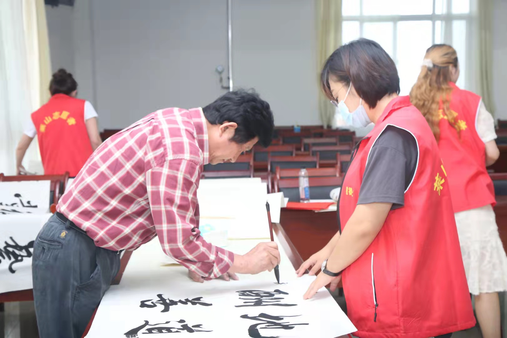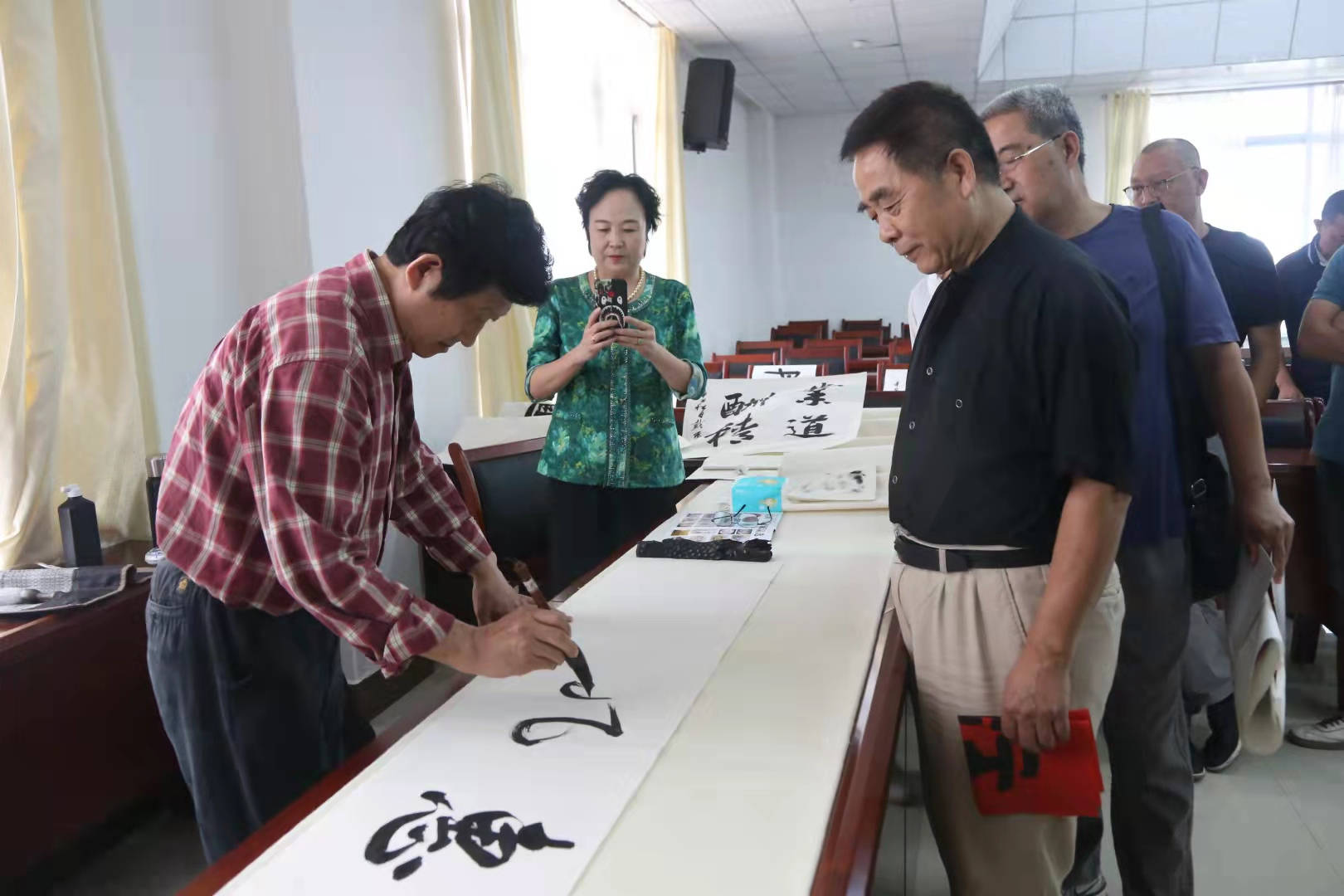 早上7点,可能很多人还没起床,戴丕昌教授已乘高铁赴烟台,赶到烟台活动现场。他简单吃了点东西,从下午1点多开始义务为参加拍卖活动的朋友书写作品,一直写到晚上六点多。