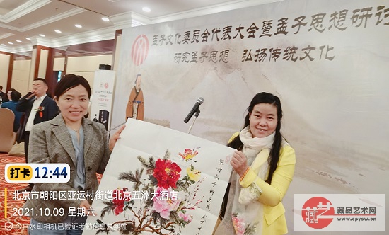 会议期间,藏品艺术网编辑、书画艺委会会员周晓彤受邀出席会议并向大会赠送了“牡丹仙子御香风”“国色天香”两幅国画牡丹作品,借此助力邹城孟子文化发展再上新台阶,全力传承中华优秀传统文化。