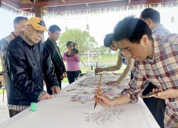 6月6日,荆门籍旅台著名书画家李可梅(左)携长女李德珍,与荆门市美术家协会主席李茂林(右)、副主席严昌金在荆门花博园展开“共绘荆门美景”第二站创作活动。经过4个小时的挥毫写意,一幅名为《两岸百花万里香》的共创作品诞生。该作品将在7日开展的李可梅个人书画展上赠予荆门市博物馆,深入推进两岸文化艺术交流,讲好两岸同根同源、融合发展的故事。(记者 李蕾蕾 通讯员 王启宏 摄)