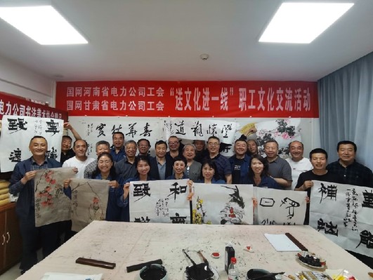本次活动,两地书画家为该公司的职工们现场创作了行书、草书、国画作品40余副,受到了职工们极大欢迎,同时也表达了两地书画家们以中国传统书画艺术为载体,讴歌新时代,传播文化美,传递正能量的美好愿景和公司工会对一线员工们的关怀和关爱,激励一线员工继续发扬扎根基层、埋头苦干的敬业意识和甘愿奉献、锐意进取的拼搏精神,以更加饱满的精神状态和工作热情,服务一方百姓,守护一片光明。(孙卫红)