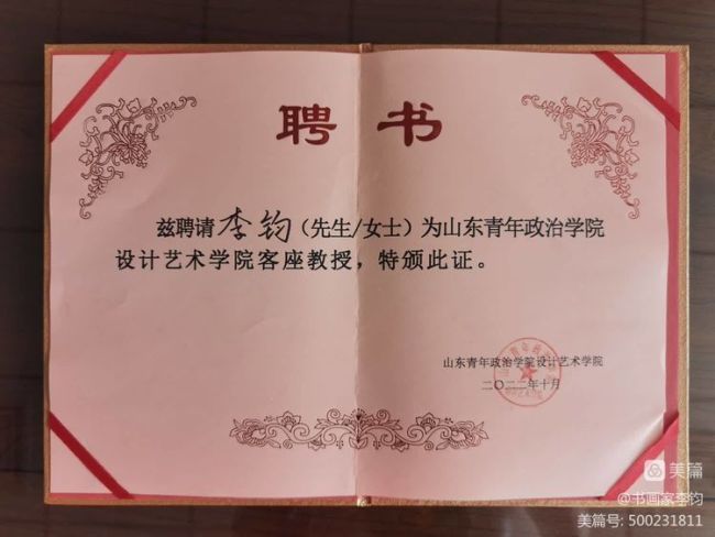 日前,山东省青年政治学院,特别聘请书画家李钧担任艺术设计学院的客座教授,并向李钧颁发了客座教授聘书。 山东青年政治学院是一所本科全日制高校,艺术设计学院,设有多个专业,书画课程是学生美育素养的基础课程。 李钧多年的书画学习创作实践中积累了丰富的经验,先后多次在中书协,省美协的展览中入展获奖,获第七届山东省文学艺术政府奖泰山文艺奖。 (来源:美篇号@书画家李钧) 书画家简介 李钧,中国书法家协会会员、山东省书法家协会理事、高级教师、济南市政协委员、山东省美术家协会会员、山东省新闻美术家协会副主席、济南市书法家协会副秘书长、济南市青年书法家协会顾问、山东省文学艺术政府奖泰山文艺奖获得者。