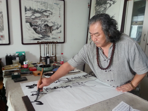 9月20日,藏品艺术网组织举办“迎中秋庆国庆”主题书画笔会。图为:书法家张成银挥毫泼墨,现场创作