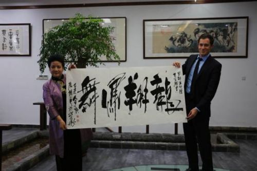 2015年10月30日,世界著名金融家罗斯柴尔德公子在北京与中国著名书画家、中国青年书法家协会副主席、国家一级美术师、宋庆龄特型演员傅继英女士就中国书画艺术如何走向世界进行亲切交流。 得知罗斯柴尔德公子与希尔顿小姐不久前举行了世纪婚礼,傅继英女士特意现场挥毫题写了寓意喜庆美好的“龙翔凤舞”四个大字相赠,并向罗斯柴尔德公子讲解了其中的寓意:“龙翔凤舞是汉族传统吉祥图案之一。龙作为中华民族的图腾,是吉祥富贵的象征;而凤为古代祥兽,多形容女子,寓意相貌脱俗,高贵典雅。希望你们婚后生活充满活力,幸福美满。” 罗斯柴尔德公子对傅继英女士现场创作的墨宝爱不释手。他还兴致勃勃地欣赏了傅继英女士近期创作的兼具传统和现代风格的绘画作品,对傅继英女士的绘画造诣赞叹不已。 傅继英女士表示,向现代风格转型、走国际化道路一直是自己孜孜以求的目标,希望通过自己的努力提升中国的书画艺术在全球的影响力,为此她将努力打造一个转型的傅继英、国际的傅继英。 罗斯柴尔德公子表示,中国的书画艺术应当而且能够在世界艺术品市场占据更加突出的位置,双方可就此开展进一步的交流与合作。