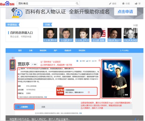 百科有名服务主要针对于企业家、书画家两大群体,目前包括贾跃亭、龚宇、王利芬等互联网企业领袖在内的数百名企业家已经申请开通。相比起普通词条而言,付费服务词条增加了职业身份板块、所属公司、公司logo(点击可链接到公司官网)、专属名片、人物资料模块等,更加权威详实。