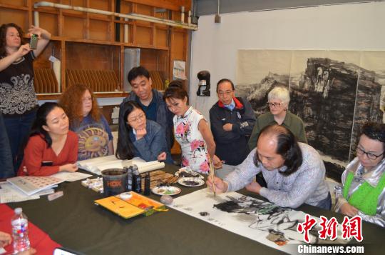 中新网达拉斯11月7日电 (刘景胜)首届中国书画专题研习营7日在美国达拉斯得州大学视觉艺术中心举行,孔子学院中方院长张乾元教授以“中国古代山水画的人文精神”为题演讲,并做中国画示范,引起到场的50多名华洋书画爱好者阵阵赞叹。