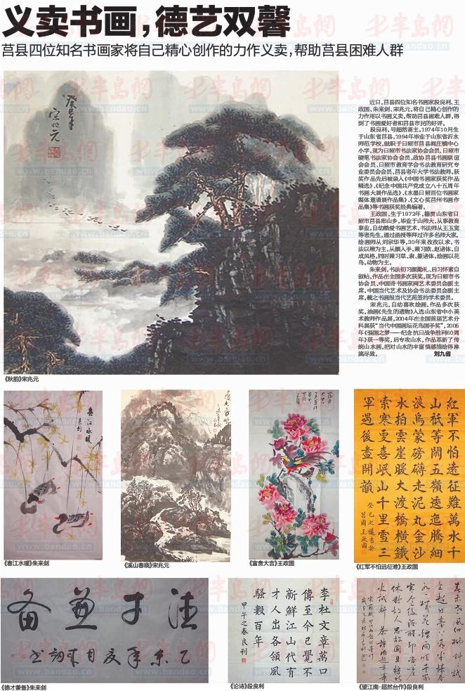 近日,莒县四位知名书画家段良利、王政国、朱来剑、宋兆元,将自己精心创作的力作用以书画义卖,帮助莒县困难人群,得到了书画爱好者和莒县市民的好评。