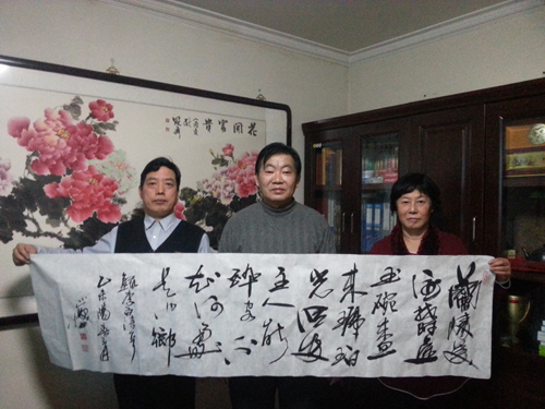 书法家刘正焕(中)与藏品艺术网书画艺术委员会副主任、编委会委员施永才大校(左)和藏品艺术网收藏艺委会理事、玉玺收藏家李厚荣女士(右)在作品前合影